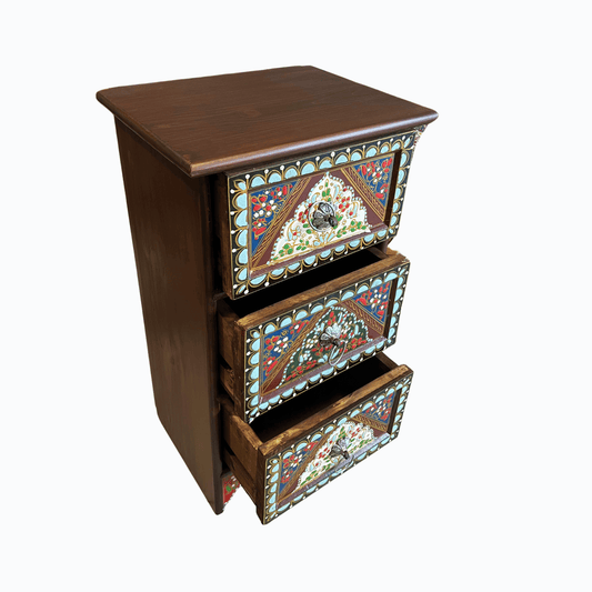 Hand Crafted Wooden Chester with 3 Drawers Floral Dark Brown